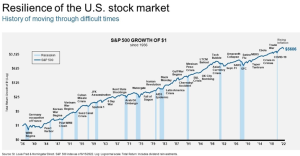 Sharp market corrections trigger fear in most people, leading to poor decision-making. This panic creates opportunity for those who stay rational and are prepared to act. Market volatility is the price that equity investors pay for superior long-term outperformance compared to bonds. The graphic below illustrates that periodic crises are merely blips in the market’s longer-term inexorable rise.