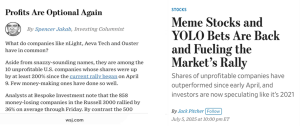 Historically, we have been at our best when markets are at their worst. The corollary is that we struggle to keep up when markets are frothy. We see signs of excessive risk-taking in the current market: SPACs are making a comeback, stock valuations are soaring, and Bitcoin, junior gold miners, and other speculative assets are hitting new highs. A few recent headlines from The Wall Street Journal should give you a sense of the speculative nature of the current market environment: